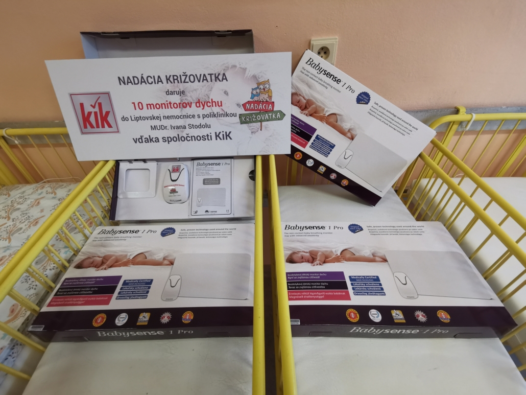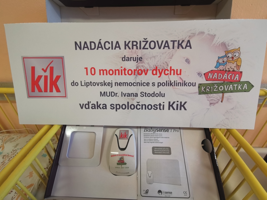 Spojením našich dvoch spoločností opäť vznikla sponzorská spolupráca, kedy nadácia z poskytnutých finančných prostriedkov zakúpila 10 kusov monitorov dychu Babysense, ktoré v najbližšej dobe darujeme do Liptovskej nemocnice s poliklinikou MUDr. Ivana Stodolu. Tento projekt spoločnosť KiK ako aj nemocnica podporujú úspešne už niekoľko rokov, za čo im patrí veľká vďaka.